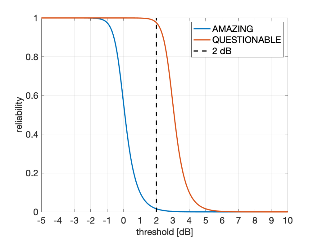 A gain of more than 6,000% sounds, well, amazing. But it also questionable: Is it good practice to state this figure of 6122%? Is it good marketing? Is it acceptable? Should it be discouraged? Is it even unethical? If claiming 6122% at 2 dB is acceptable, how about a 25119% gain at 10 dB? Here the absolute reliability of AMAZING is 6.3e-9, and that of QUESTIONABLE is 1.60e-6. Not a practical regime, but a more than 25000% gain nonetheless.